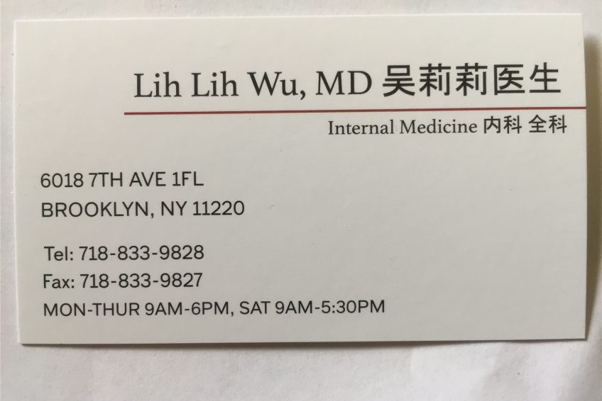 内科全科Lih Lih Wu MD 吴莉莉医生71S-833-9828 6018 7TH AVE 1FL BROOKLYN, NY 11220