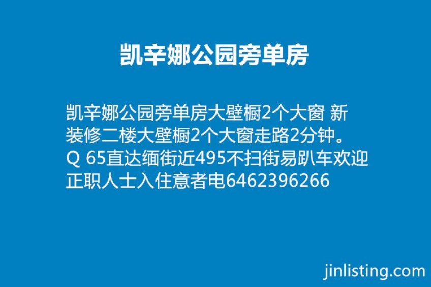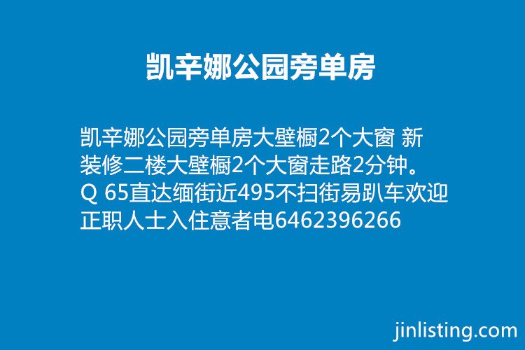 凯辛娜公园旁单房大壁橱2个大窗 新装修二楼大壁橱2个大窗走路2分钟。Q 65直达缅街近495不扫街易趴车欢迎正职人士入住意者电6462396266