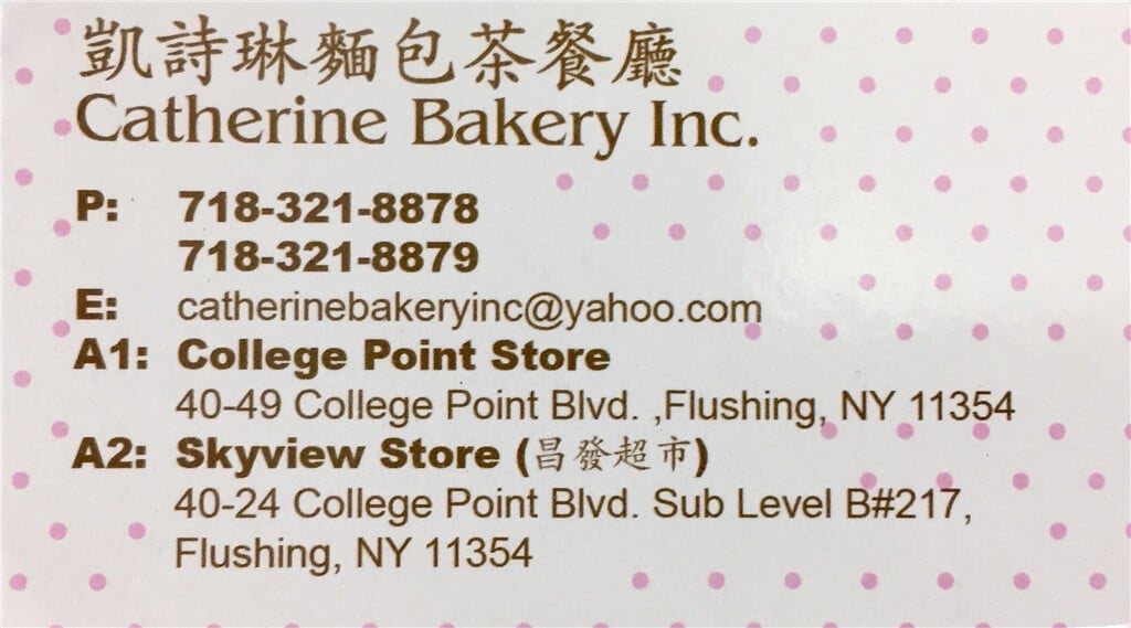 凱詩琳麵包茶餐廳 Catherine Bakery Inc. 718-321-8878 718-321-8879 catherinebakeryinc@yahoo.com A1:College Point Store 40-49 College Point Blvd., Flushing NY11354 Skyview Store(昌發超市) 40-24 College Point Blvd. Sub Level B#217 Flushing, NY 11354