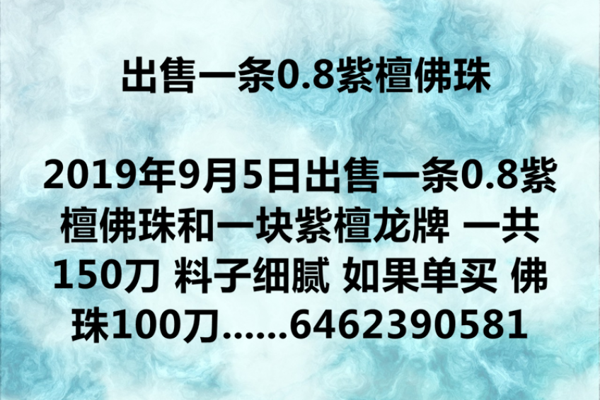 出售一条0.8紫檀佛珠和一块紫檀龙牌 一共150刀 料子细腻 如果单买 佛珠100刀 龙牌50刀 纽约自取 喜欢的朋友可加微信 odinsven 电话 6462390581