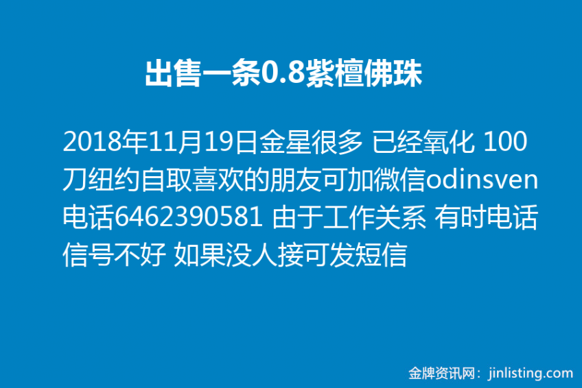 出售一条0.8紫檀佛珠 金星很多 已经氧化 100刀 纽约自取 喜欢的朋友可加微信odinsven 电话6462390581 由于工作关系 有时电话信号不好 如果没人接可发短信