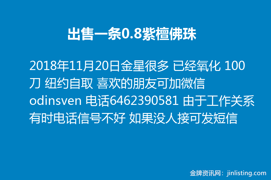 出售一条0.8紫檀佛珠 金星很多 已经氧化 100刀 纽约自取 喜欢的朋友可加微信odinsven 电话6462390581 由于工作关系 有时电话信号不好 如果没人接可发短信
