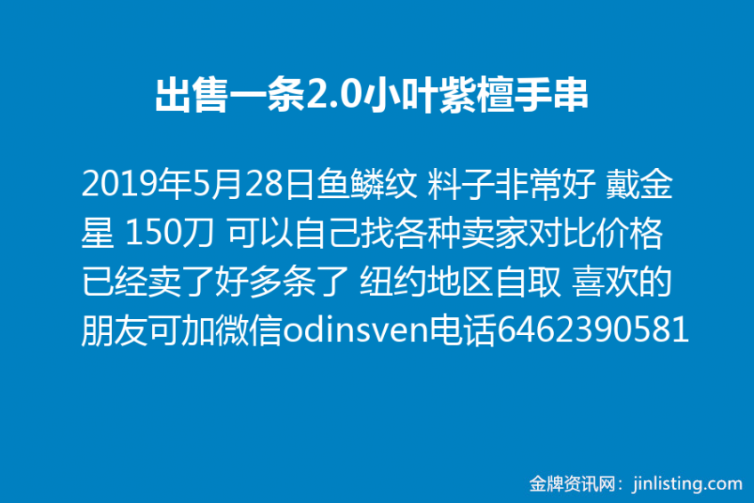 出售一条2.0小叶紫檀手串 鱼鳞纹 料子非常好 戴金星 150刀 可以自己找各种卖家对比价格 已经卖了好多条了 纽约地区自取 喜欢的朋友可加微信 odinsven 电话 6462390581