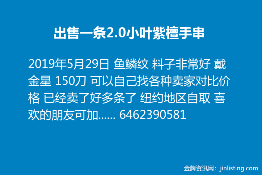 出售一条2.0小叶紫檀手串 鱼鳞纹 料子非常好 戴金星 150刀 可以自己找各种卖家对比价格 已经卖了好多条了 纽约地区自取 喜欢的朋友可加微信 odinsven 电话 6462390581