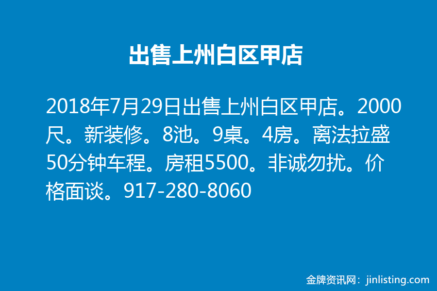 出售上州白区甲店。2000尺。新装修。8池。9桌。4房。离法拉盛50分钟车程。房租5500。非诚勿扰。 价格面谈。917-280-8060