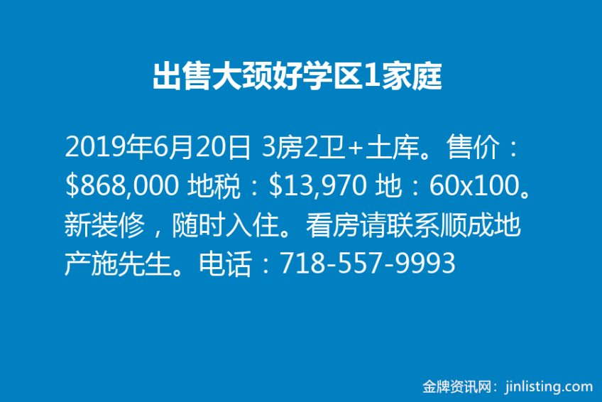 出售大颈好学区1家庭,3房2卫+土库。售价:$868,000 地税:$13,970 地:60×100。新装修,随时入住。看房请联系顺成地产施先生。电话:718-557-9993 微信:7185579993
