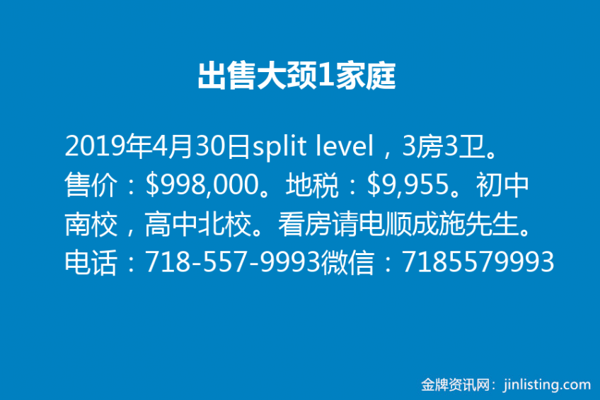 出售大颈1家庭,split level,3房3卫。售价:$998,000。地税:$9,955。初中南校,高中北校。看房请电顺成施先生。电话:718-557-9993。微信:7185579993