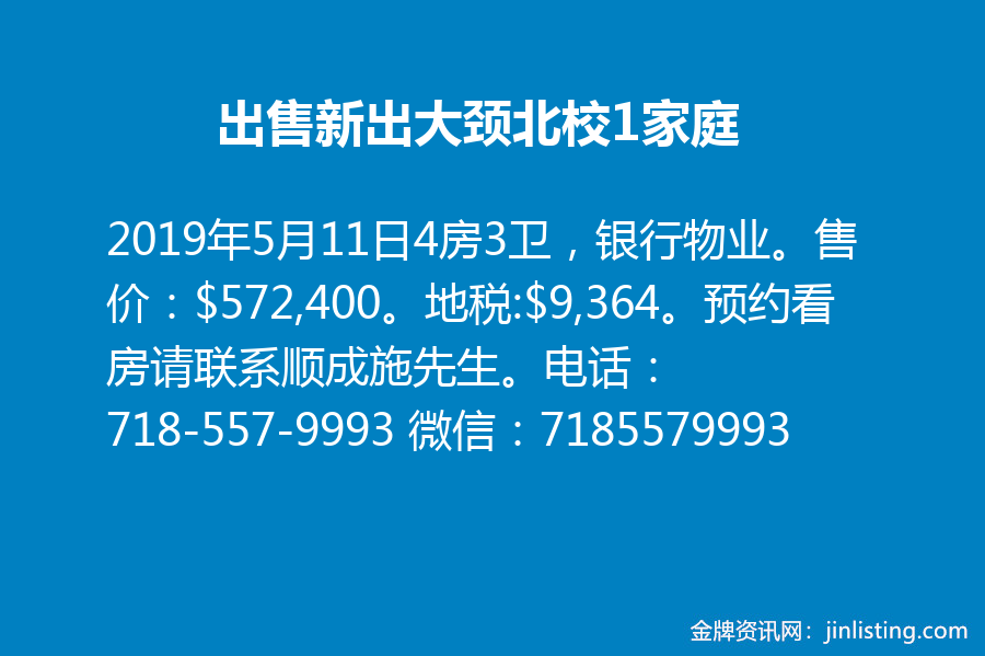 出售新出大颈北校1家庭 4房3卫,银行物业。售价:$572,400。地税:$9,364。预约看房请联系顺成施先生。电话:718-557-9993 微信:7185579993