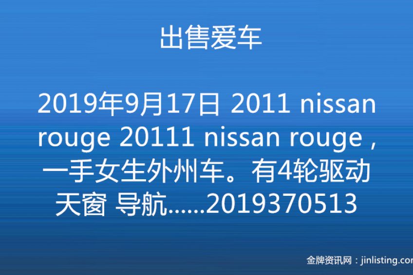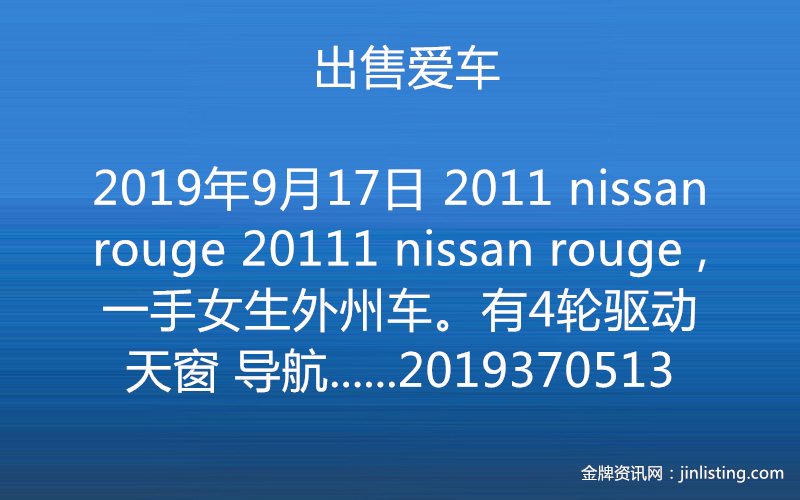 出售爱车,2011 nissan rouge 20111 nissan rouge ,一手女生外州车。有4轮驱动 天窗 导航 倒车摄像头,应准备在纽约长期发展 用车几率不多。且停车罚单吃了太多,现忍痛割爱(可GIFT)。有意者请联系2019370513,如无人接听请发短信。