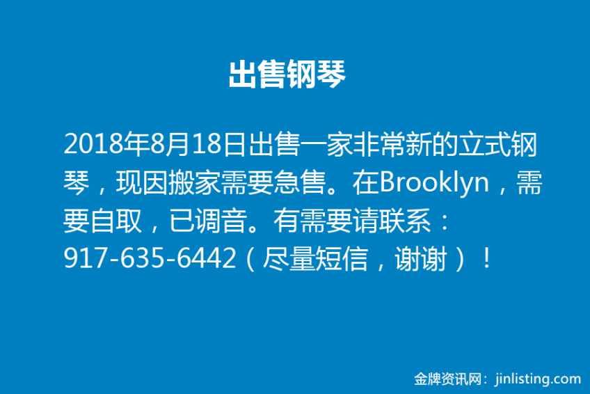 出售钢琴 出售一家非常新的立式钢琴,现因搬家需要急售。在Brooklyn,需要自取,已调音。有需要请联系:917-635-6442(尽量短信,谢谢)!价格:600。