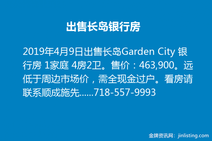 出售长岛Garden City 银行房 1家庭 4房2卫。售价:463,900。远低于周边市场价,需全现金过户。看房请联系顺成施先生。联系电话:718-557-9993 微信:7185579993
