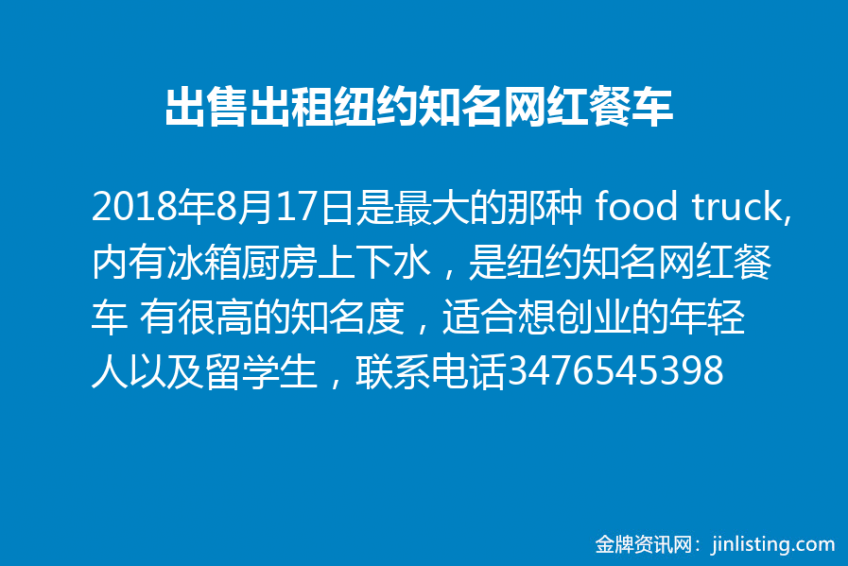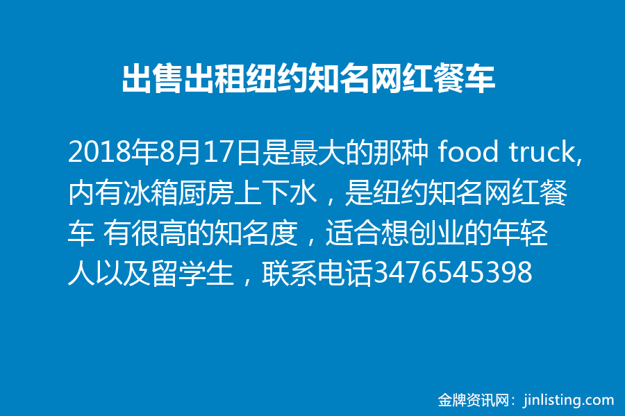 是最大的那种 food truck, 内有冰箱 厨房 上下水,是纽约知名网红餐车 有很高的知名度,适合想创业的年轻人以及留学生,联系电话3476545398,或加微信6534285,多谢