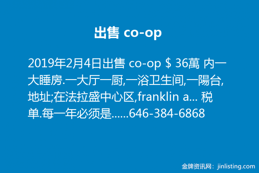 出售 co-op $ 36萬 内一大睡房.一大厅一厨,一浴卫生间,一陽台,地址;在法拉盛中心区,franklin a… 税单.每一年必须是$ 5萬.另间condo復式兩層内有1,400平方伬,内有3睡房2浴卫生间一厅一厨,地址132-18 sanford av法垃盛中心区有意者請打电話646-384-6868