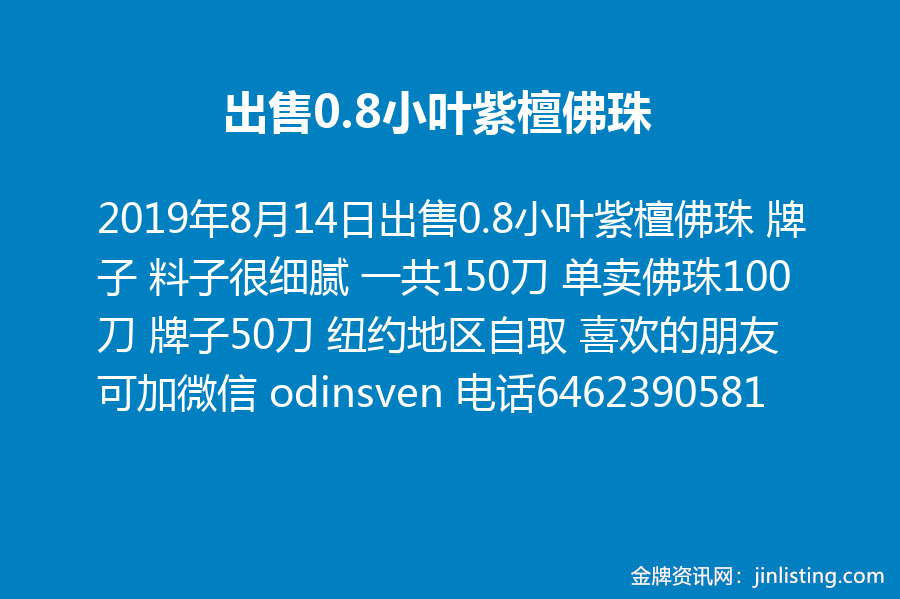 出售0.8小叶紫檀佛珠 牌子 料子很细腻 一共150刀 单卖佛珠100刀 牌子50刀 纽约地区自取 喜欢的朋友可加微信 odinsven 电话6462390581