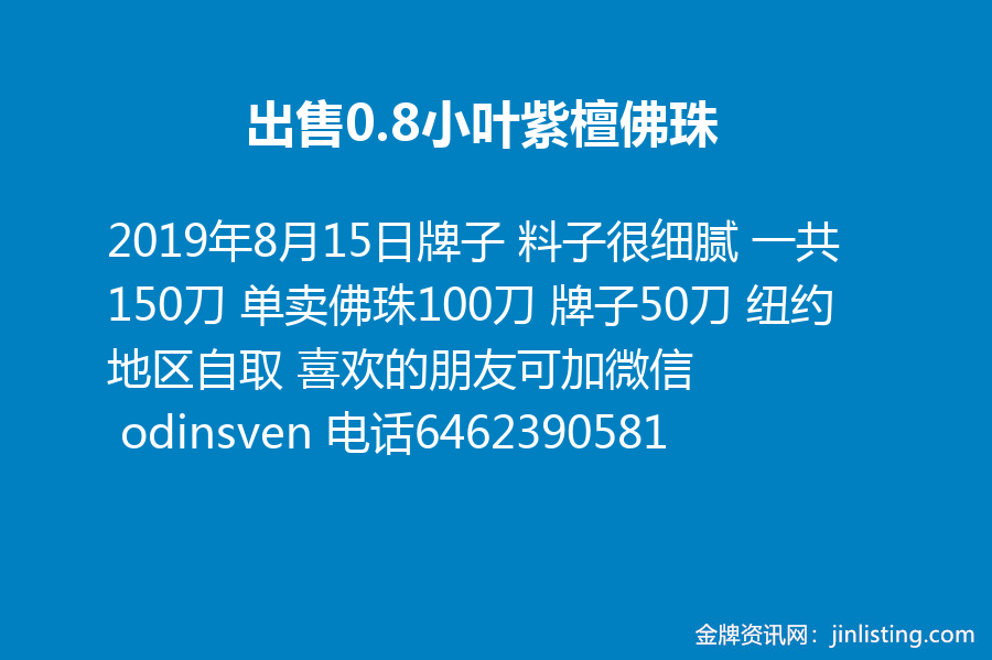 出售0.8小叶紫檀佛珠 牌子 料子很细腻 一共150刀 单卖佛珠100刀 牌子50刀 纽约地区自取 喜欢的朋友可加微信 odinsven 电话6462390581