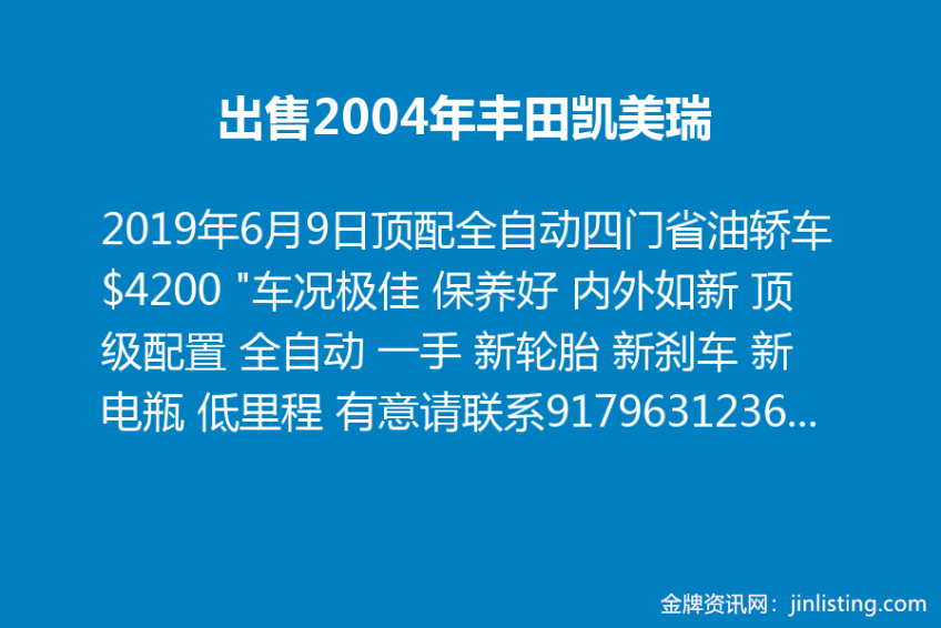 出售2004年丰田凯美瑞顶配全自动四门省油轿车 $4200 “车况极佳 保养好 内外如新 顶级配置 全自动 一手 新轮胎 新刹车 新电瓶 低里程 有意请联系9179631236 法拉盛看车”