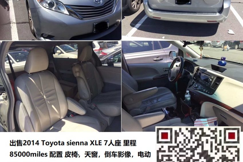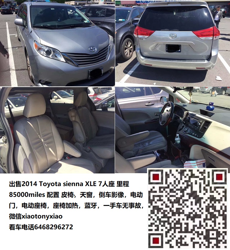 出售2014 Toyota sienna XLE 7人座 里程85000miles 配置 皮椅,天窗,倒车影像,电动门,电动座椅,座椅加热,蓝牙,一手车无事故,微信xiaotonyxiao 看车电话6468296272