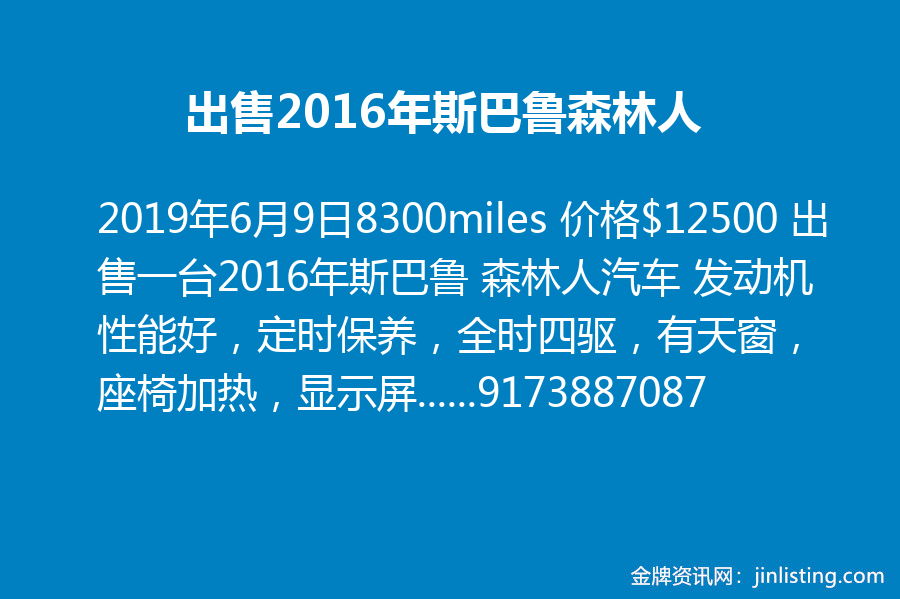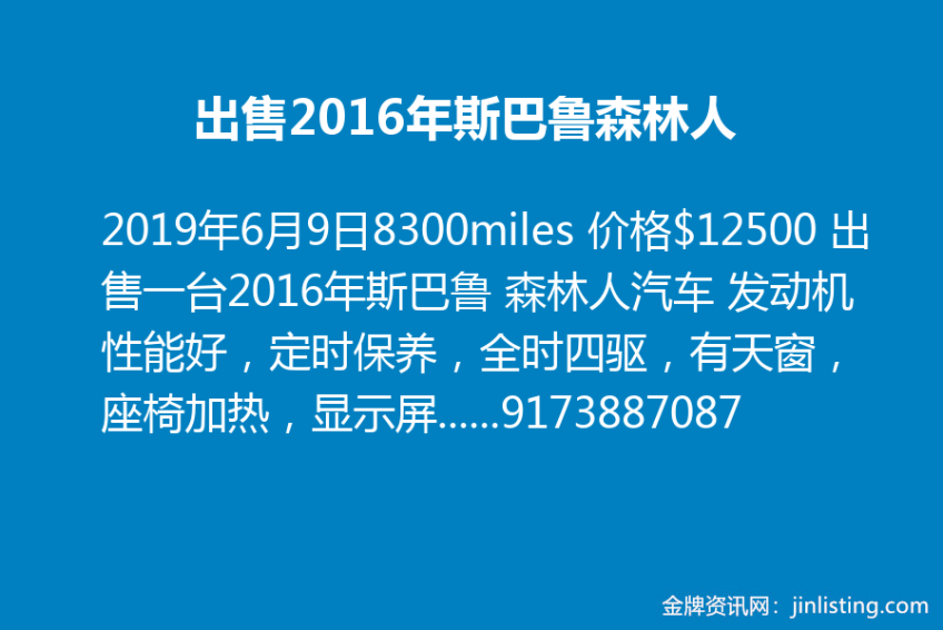 出售2016年斯巴鲁森林人 8300miles 价格$12500 出售一台2016年斯巴鲁 森林人汽车 发动机性能好,定时保养,全时四驱,有天窗,座椅加热,显示屏,蓝牙连接,倒车影像等!坐标~纽约法拉盛或者布鲁克林可上门看车! 电话:9173887087