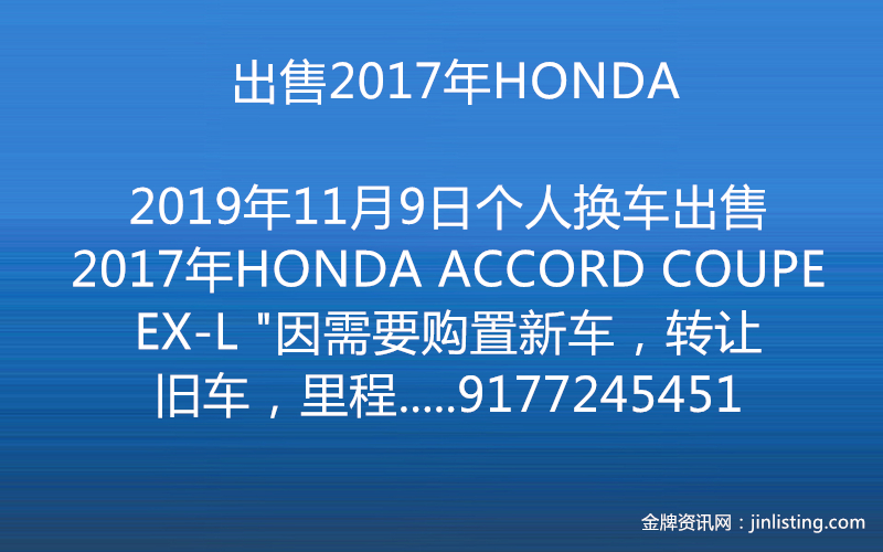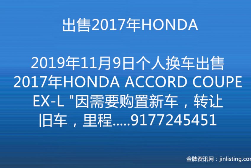 个人换车出售2017年HONDA ACCORD COUPE EX-L “因需要购置新车,转让旧车, 里程仅9000mile,如新车 坐标Brooklyn 有意请联系 Mina:9177245451 微信:minming418 请备注honda”