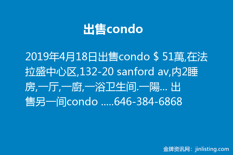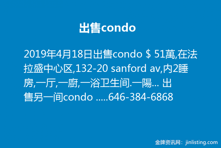 出售condo $ 51萬,在法拉盛中心区,132-20 sanford av,内2睡房,一厅,一廚,一浴卫生间.一陽… 出售另一间condo $55萬5,復式兩層,内有3睡房一厅一廚2浴卫生间,地址132-18 1 F sanford av法拉盛中心区. 另丶一间condo $86 萬5,複式兩層,内有4睡房2厅,2厨2浴卫生间有後院朝南兩層各有独立门口進出,地址132-18 1R sanford av 近7号地镻总站.近超级市場近缅街十分亣便.上面任何一间有意者請打电話646-384-6868