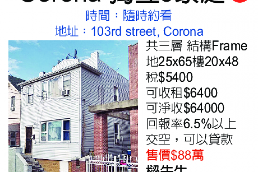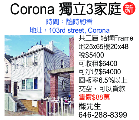 共三層,結構Frame,地25×65. 樓20×48. 稅$5400,可收租$6400,可淨收$64000,回報率6.5%以上。交空,可以貸款。售價$88萬。