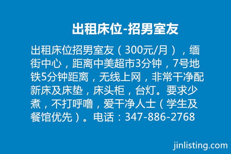 出租床位招男室友(300元/月),缅街中心,距离中美超市3分钟,7号地铁5分钟距离,无线上网,非常干净配新床及床垫,床头柜,台灯。要求少煮,不打呼噜,爱干净人士(学生及餐馆优先)。电话:347-886-2768