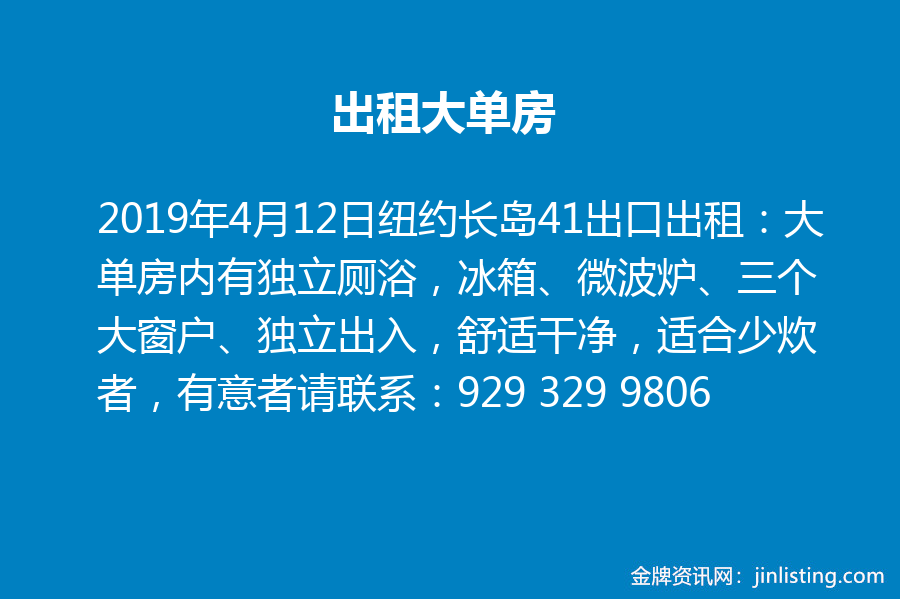 纽约长岛41出口出租:大单房内有独立厕浴,冰箱、微波炉、三个大窗户、独立出入,舒适干净,适合少炊者,有意者请联系:929 329 9806