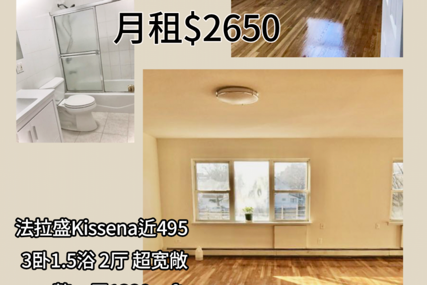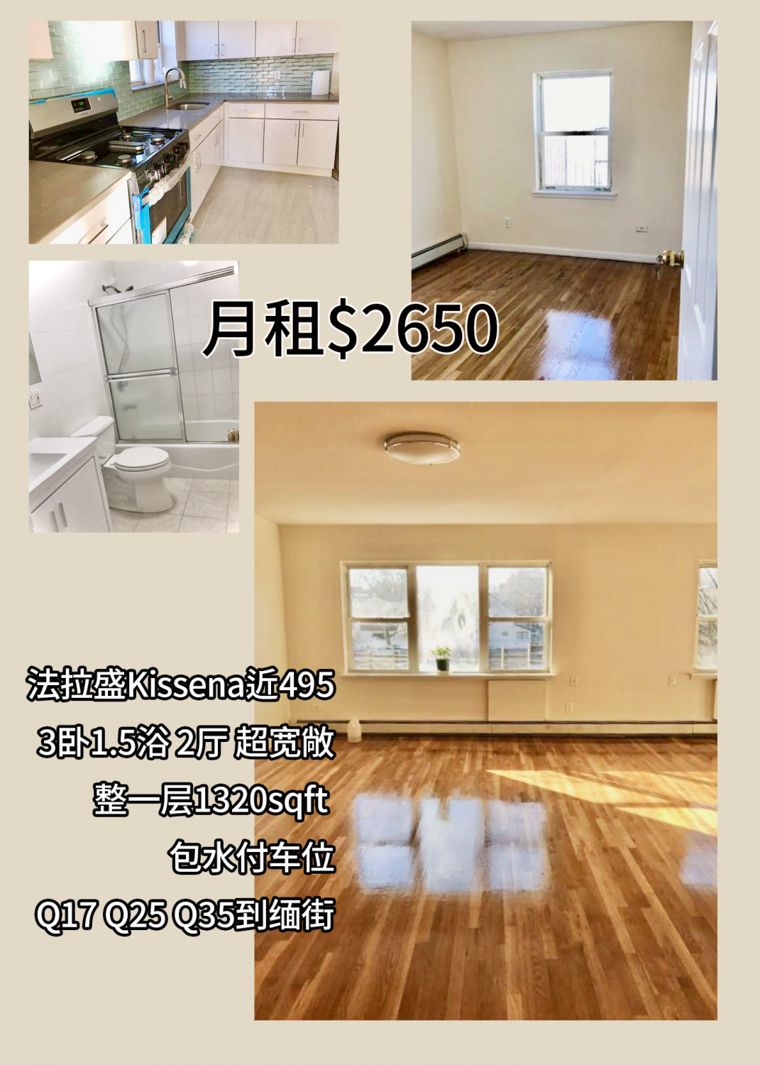 出租 | 法拉盛Kissena近495, 3卧1.5浴 2厅 超宽敞 整一层1320sqft 包水付车位 Q17 Q25 Q35到缅街 月租$2650,适合一家人,欢迎合作! Eva 9292042623