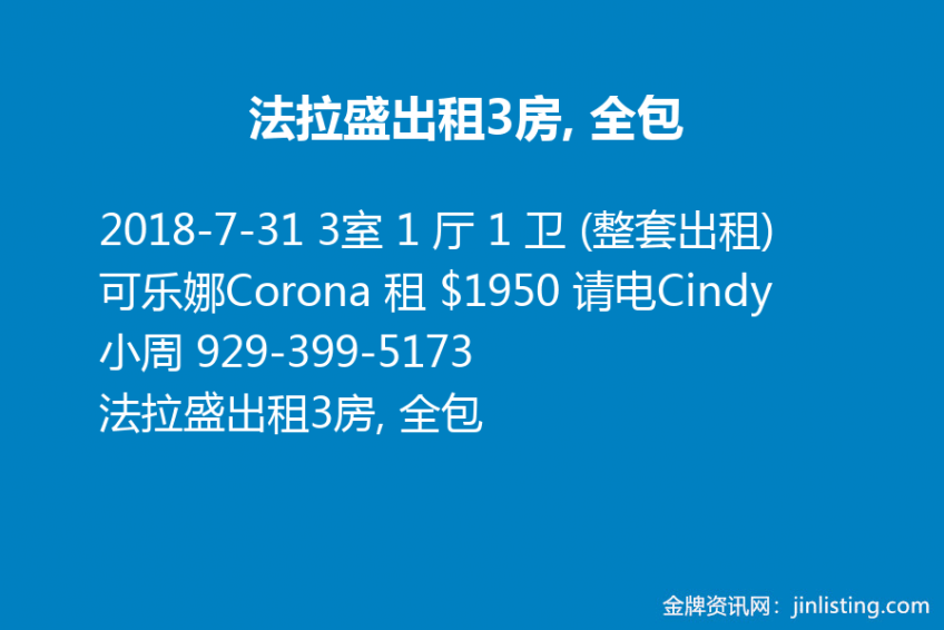 法拉盛出租3房, 全包-可乐娜Corona 租 $1950 请电Cindy 小周 929-399-5173