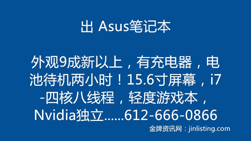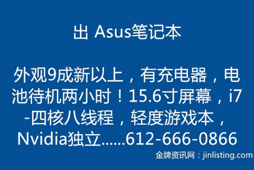 出 Asus笔记本 外观9成新以上,有充电器,电池待机两小时! 15.6寸屏幕,i7-四核八线程,轻度游戏本,Nvidia独立显卡2G,8G内存,750g机械硬盘,无线网卡 因错误修改DVMT 64m 到128m 不能开机! 需要刷BIOS才能开机,需要刷BIOS才能开机,需要刷BIOS才能开机! $200出,也可以拆分卖,详情电话聊:612-666-0866 可接讯息!