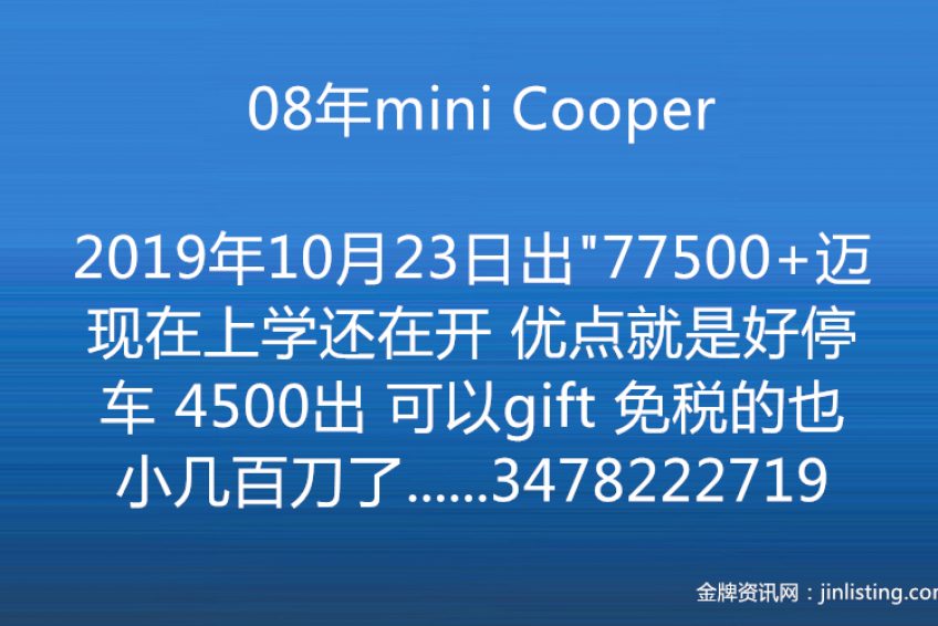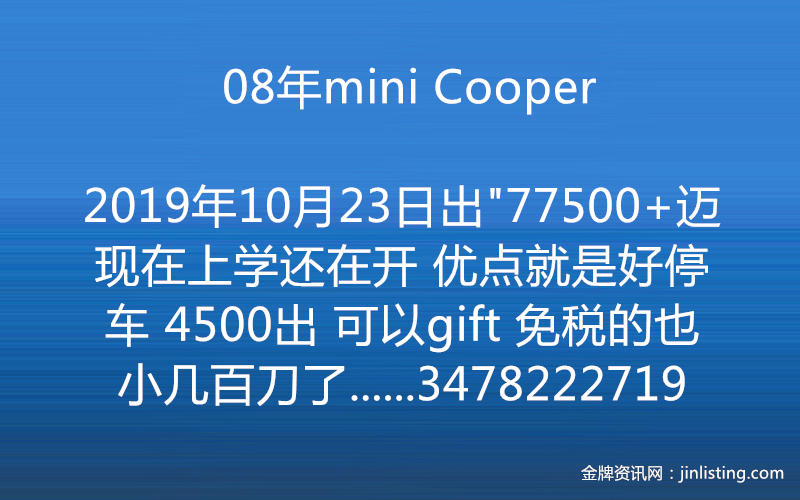 出08年mini Cooper “77500+迈 现在上学还在开 优点就是好停车 4500出 可以gift 免税的也小几百刀了 车外观有划痕 剐蹭 毕竟那么久的车了少许也正常没有撞凹的 刚换了齿轮油 轮胎和刹车片几千迈 3478222719 车在贝塞”