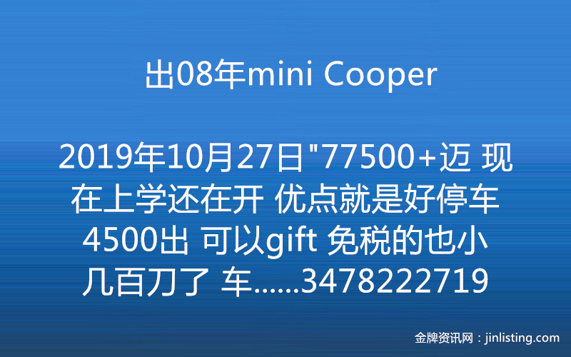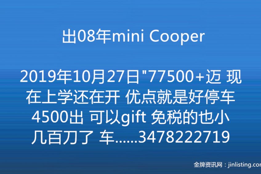 出08年mini Cooper “77500+迈 现在上学还在开 优点就是好停车 4500出 可以gift 免税的也小几百刀了 车外观有划痕 剐蹭 毕竟那么久的车了少许也正常没有撞凹的 刚换了齿轮油 轮胎和刹车片几千迈 3478222719 车在贝塞”