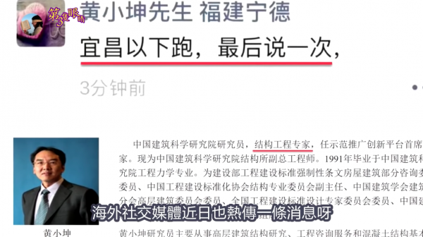 海外社交媒体近日也热传一条消息,疑是拥有国家一级注册结构工程师、中国建筑科学研究院博士生导师、建研科技股份有限公司总工程师等多个头衔的黄小坤,在微信朋友圈发出警告:“宜昌以下跑,最后说一次”。