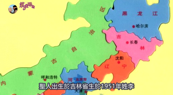 圣人出生在中国金鸡目,大家知道中国地图是一只鸡的形状,金鸡目就是指鸡眼睛的位置,刚好是吉林省,也就是说《推碑图》中说圣人出生在吉林省。接着再看,《推碑图》中又说,圣人出生在虎兔之年,《金陵塔碑文》中说圣人出生在木兔之年,所以可以定下来,圣人出生在1951年木兔年。接着《推碑图》中又说,圣人以木子为姓,就是姓李。这刚好找到了另一个木字。