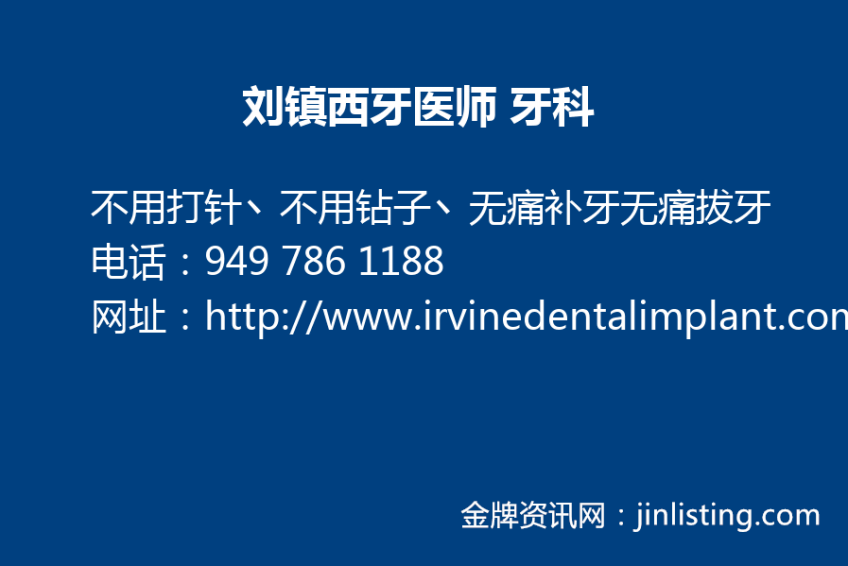 劉鎮西牙醫師(Chris C. Liu,DDS)診所,視您的微笑為我們首要任務,無微不致的醫護關懷,回歸您牙齒的自然本質。當您親臨我們位於爾灣的牙醫診所,您美麗的微笑是我們服務的目標,我們的醫療團隊,高標準的自我要求,給予您安全性丶教育性丶預防性的牙齒護理觀念,針對您不同的需求,解決您牙齒上種種煩惱,我們溫柔親切的關懷丶將深獲您心。劉鎮西牙醫師(Chris C. Liu,DDS)採用21世紀最新雷射Waterlase MD牙科科技,免除您傳統看牙醫的恐懼,不用打針丶不用鑽子丶無痛補牙丶無痛拔牙,我們尊重您每一次預約的時間,承諾準時為您看診,不讓您看牙醫卻等很久。我們的服務項目眾多,舉凡一般牙科丶兒童牙科丶人工植牙丶牙床骨髓移植丶鼻竇移植手術… ..等。從一般牙齒護理丶到專業的齒科手術,劉鎮西醫師親自了解關懷,給予您百分之百的保證。請立即與我們預約,我們將讓您重拾信心滿滿的微笑。