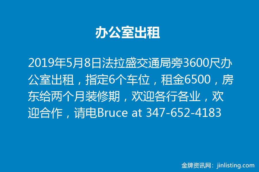 法拉盛交通局旁3600尺办公室出租,指定6个车位,租金6500,房东给两个月装修期,欢迎各行各业,欢迎合作,请电Bruce at 347-6