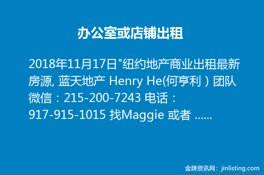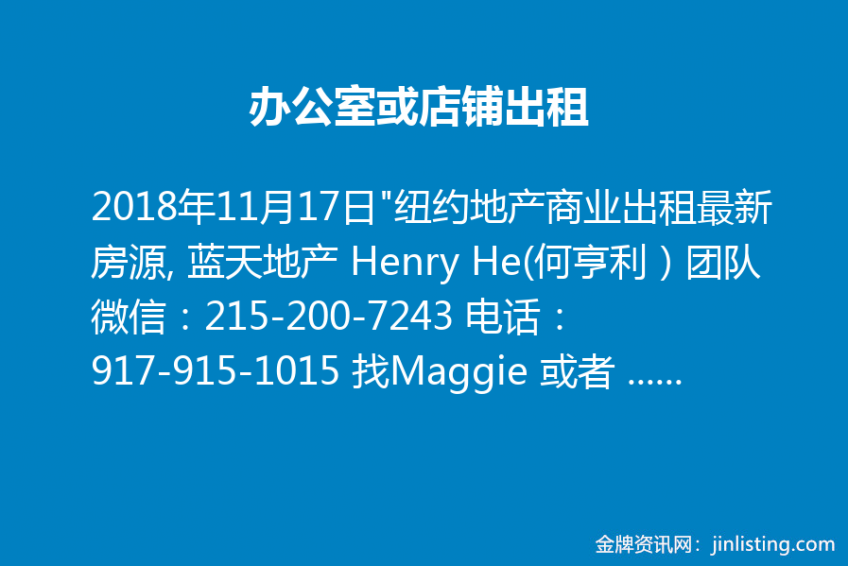 办公室或店铺出租 “纽约地产商业出租最新房源, 蓝天地产 Henry He(何亨利)团队 微信:215-200-7243 电话:917-915-1015 找Maggie 或者 Henry 215-200-7243 1,法拉盛中心黄金地段,一楼750平方尺和地下室750平方尺, 必须一起租$9000/月。 2,法拉盛Beech Ave上的1楼+地下室,出租$2500。 900平方英尺每层,双层医疗办公室, 出租停车场,每月租金$ 150。 3, 法拉盛500SQF一楼办公室出租$1000,3分钟到缅街,到公车站Q20A, Q20B和Q44,到公园植物园。 4,法拉盛164 Street LIRR火车站旁约1000平方尺店面,出租$3000 适合任何生意。方便街边停车”