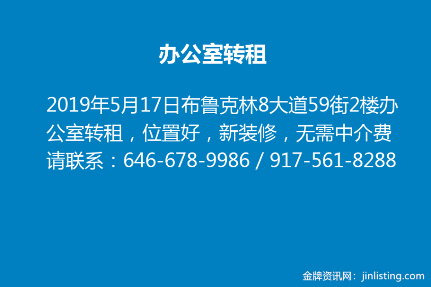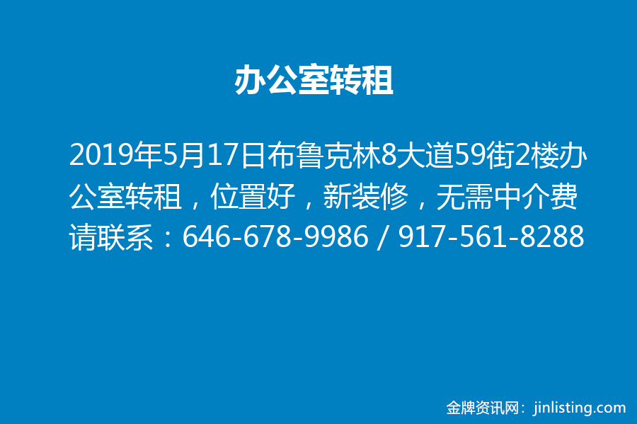 布鲁克林8大道59街2楼办公室转租,位置好,新装修,无需中介费 请联系 : 646-678-9986 / 917-561-8288