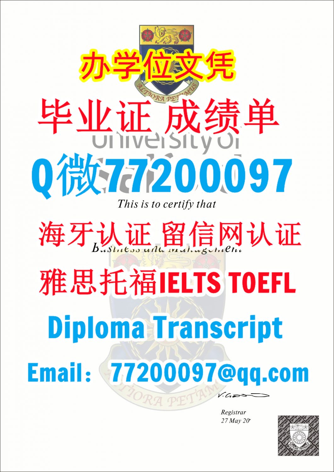 办本科硕士学历alford学位证书做索尔福德大学文凭证书Q/微:77200097有Salford文凭证书精仿Salford毕业证书能办Salford成绩单制作索尔福德大学学位证书雅思托福University of Salford Diploma Degree Transcript