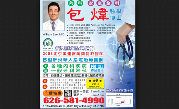 我们的目标是为客户提供最优质的护理,及时、高效和关怀的方式。我们相信在保持患者及其家属充分知情下,必将病人照顾得宜和家庭的高度配合,病人将得到最好的照料及治疗。我们尽一切努力,促进高质量,、高效的护理敏感和负责任的态度。 包炜医学博士是2008年奥运会特派医师,这样的资格绝对能作为您的主治医生和顾问。我们的医生已经履行了所有规定要求,顺利通过了笔试和一个文凭也是美国内科医学委员会。局认证代表奉献敬业精神最高水平的病人护理师,这代表了卓越的知识、临床技能和人文素质的医生。 包炜医学博士背景如下: ‐委员会认证的内科 ‐会员,临床病理学家美国社会 ‐局认证的医疗技术 ‐普外科,上海第二医科大学 ‐医务化验师,艾森豪威尔医疗中心 ‐内科住院医师,南加州大学 ‐主治医师,惠医疗中心 ‐参加医生,长老会共同性医院 ‐美国全国广播公司的团队医师,2008年北京奥运会主治各种内科疾病及一般外科妇科,附设门诊小手术、心电图、疫苗注射、物理治疗等等,包炜医学博士推荐给您最棒的家庭科医生。
