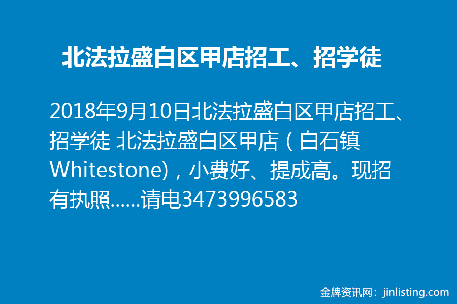 北法拉盛白区甲店招工、招学徒 北法拉盛白区甲店(白石镇Whitestone),小费好、提成高。现招有执照经验小工F/P或晚班工,需拔毛好,住附近优先。另招学徒,教全套指甲技术和英文,学成留店。请电3473996583
