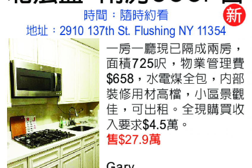 一房一廳現已隔成兩房,面積725呎,物業管理費$658水電煤全包,內部裝修用材高檔,小區景觀佳,可出租。全現購買收入要求$4.5萬,售$27.9萬。 Gary 929-402-6756