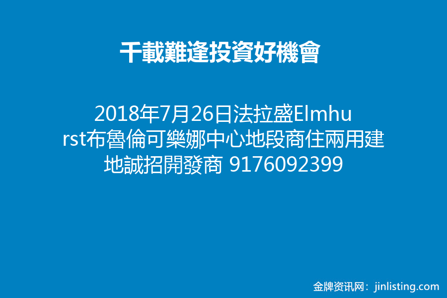 現有法拉盛,Elmhurst,布魯倫,可樂娜和Staten island 中心地段,商住兩用建地,誠招開發商,共同開發,建造高檔寫字樓,豪華住宅樓,酒店和娛樂場.歡迎經紀合作!917-609-2399