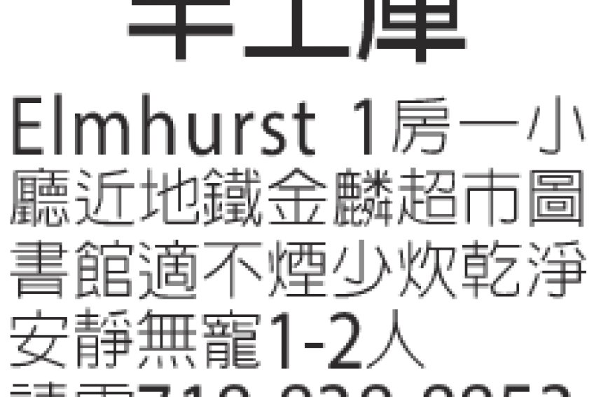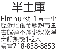 Elmhurst 1房1小廳 近地鐵 金麟超市圖書館適不煙少炊乾淨安靜無寵1-2人718-838-8853
