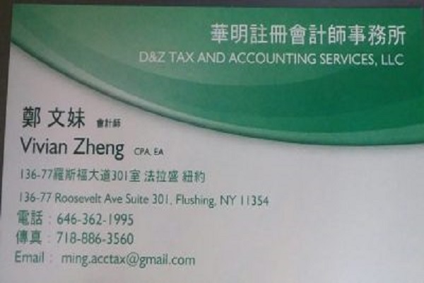 华明注册会计师事务所(華明註冊會計師事務所) 鄭文妹,会計師 地址:136-77羅斯福大道301室法拉盛紐約 136-77 Roosevelt Ave Suite 301,Flushing, NY I 1354 電話:646-362-1995 傳真:718-886-3560 Email:ming.acctax@gmail.com