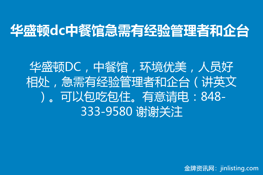 【经验企台】【经验企台】 华盛顿DC,中餐馆,环境优美,人员好相处,急需有经验管理者和企台(讲英文)。可以包吃包住。有意请电:848-333-9580 谢谢关注