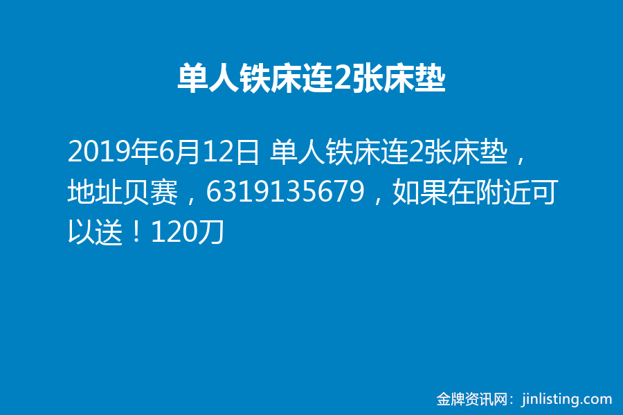 单人铁床连2张床垫,地址贝赛,6319135679,如果在附近可以送!120刀