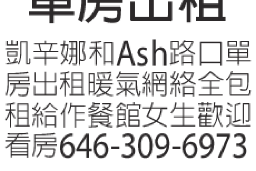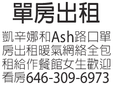 租给作歺馆女生,开西娜和ASH路口单房出租、暧气、网络。全包、欢迎看房。电话:646-309-6973