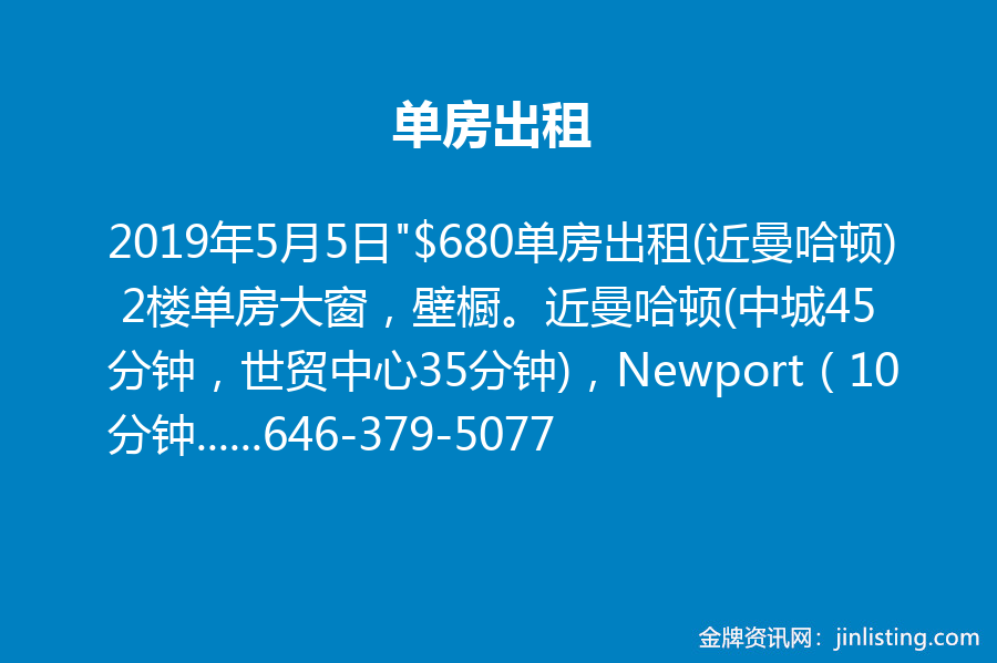 “$680单房出租(近曼哈顿) 2楼单房大窗,壁橱。近曼哈顿(中城45分钟,世贸中心35分钟),Newport(10 分钟)。3分钟走到轻轨车站。包水电煤暧和网络,可供家具,拎包入住。不吸烟,无宠物。月租$680。详情请电:646-379-5077(中文,English) 或 718-612-4585(韩文 Korean)。 地址:56 Danforth Ave., Jersey City, NJ 07305 邮箱:yzong56@yahoo.com”