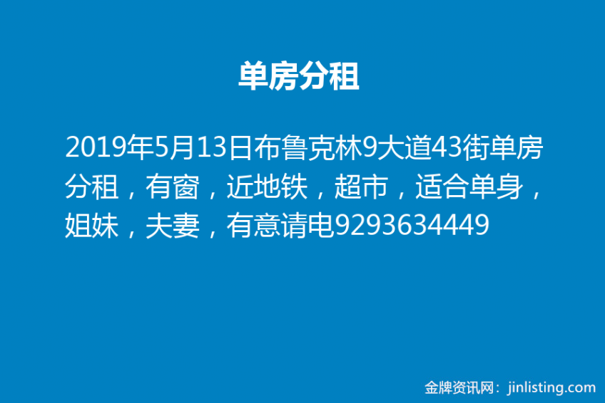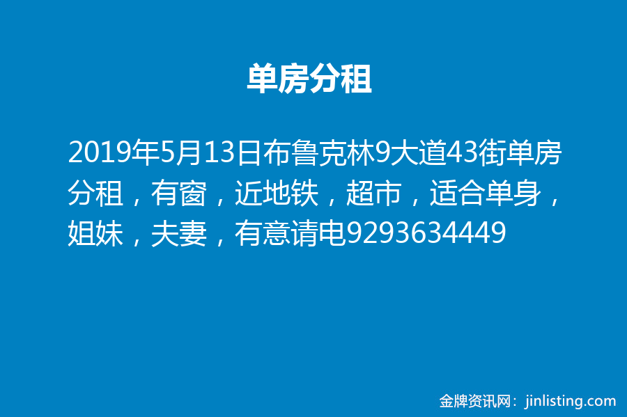 布鲁克林9大道43街单房分租,有窗,近地铁,超市,适合单身,姐妹,夫妻,有意请电9293634449